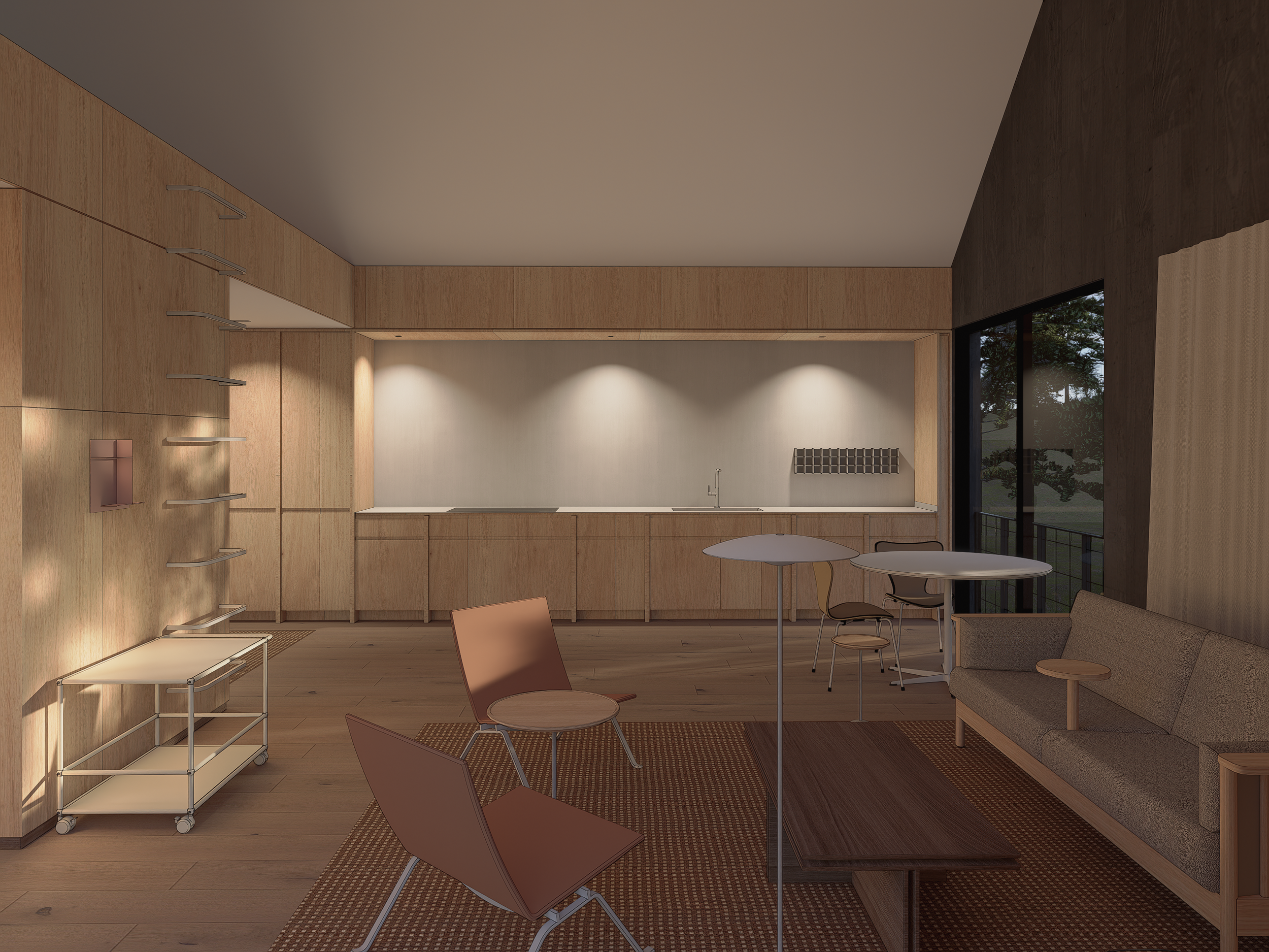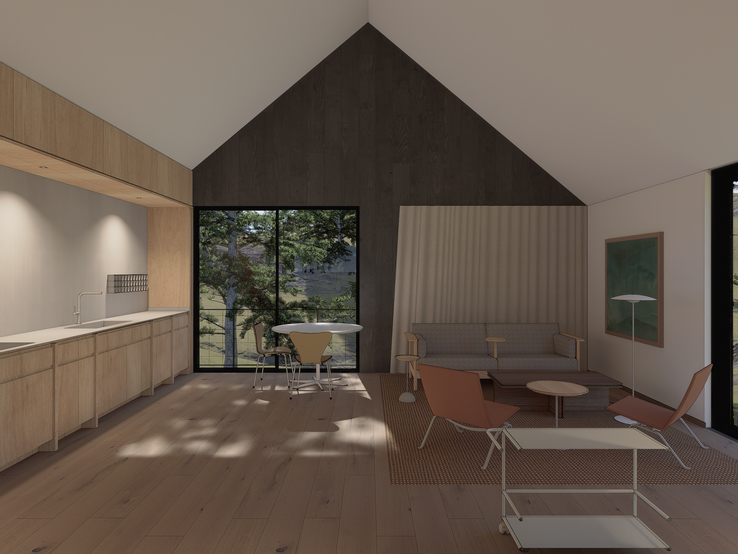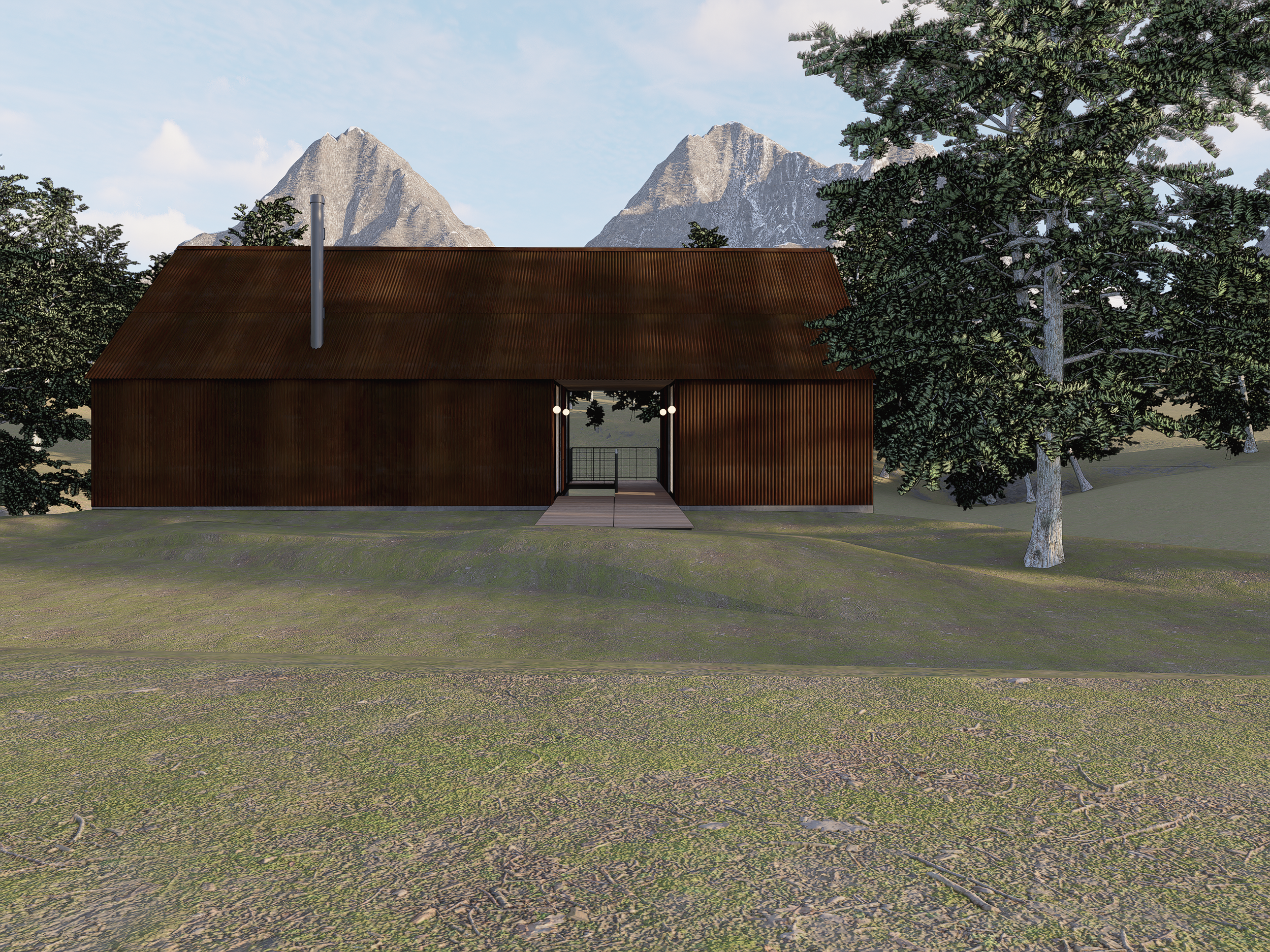 In the foothills of the Rockies, near Boulder, CO, this private residence emerges from the earth and serves as a threshold to the landscape beyond. By embedding the building into the natural contours of the landscape and providing access on two levels, the lower of which is to be used as storage and a workshop for a carpenter/craftsman. The studio, separate from the living and sleeping quarters, provides a sense of solitude. The sleeping quarters, perched in a loft, aligning with the same datum of the main entry threshold, overlooking the terrain. The “dog-run” opens to both sections of the residence, capitalizing on cross ventilation and providing a strong axial relationship between the landscape and internal spaces. The singular form is wrapped in weathered corrugated metal, continuing into the cave-like “dog-run”. Sliding barn doors on the lower level transform the figure into a monolithic structure embedded within the sloped terrain.